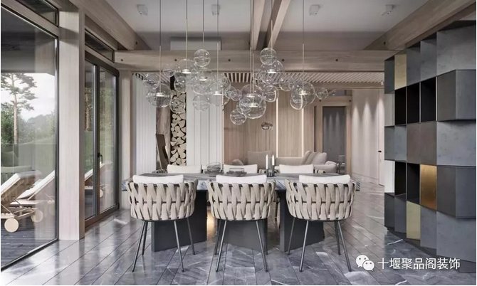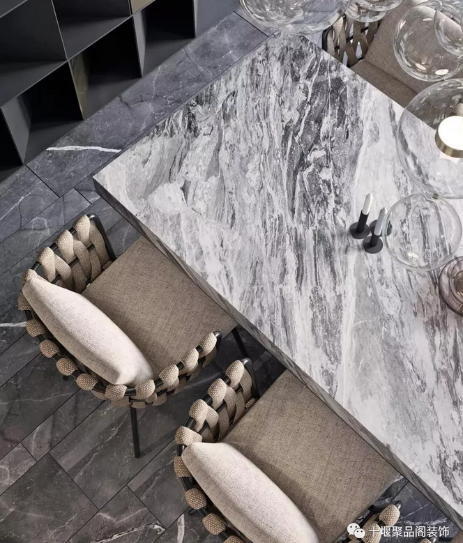 餐厅的灰色大理石桌面与针织物椅子搭配,硬朗中又带有温和,还有造型特殊的隔断墙 ▼